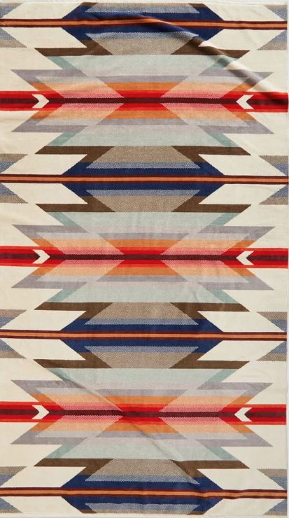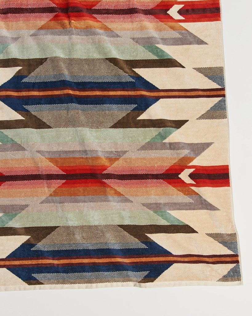 Supersized towel featuring exclusive Wyeth Trail pattern, woven of cotton velour in vivid colors that stay true, wash after wash. Sheared on one side for softness, looped on the other for superior absorption. A luxury you'll love for the beach, hot tub or pool.